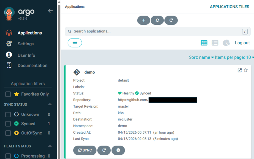 以下の画像のように、Githubとargocdの同期が成功し、demoのnamespace等、必要なリソースが自動作成される。