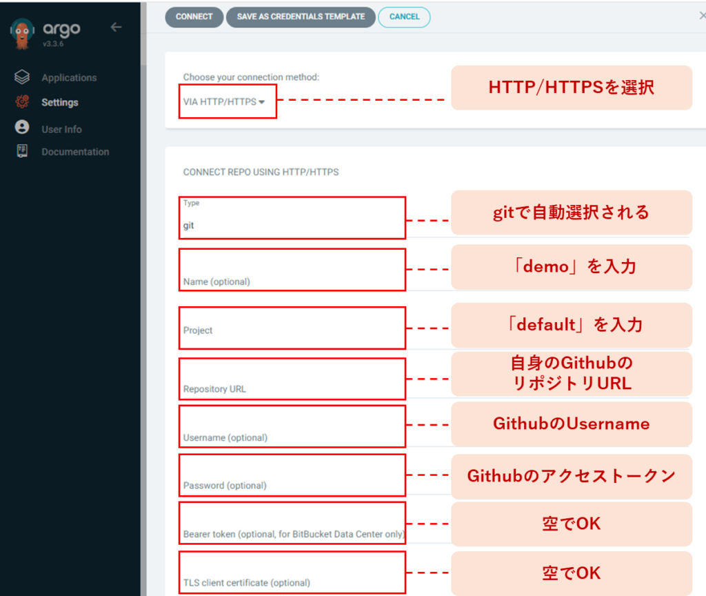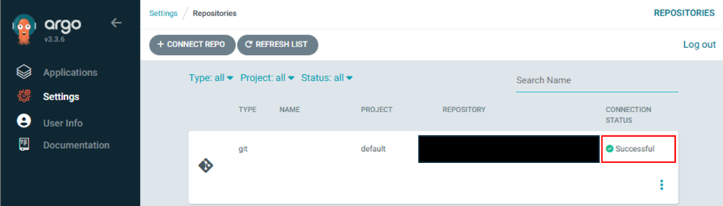 認証設定を実施してしばらくまつか、再度「kubectl apply -n argocd -f application.yaml」を実行すると、