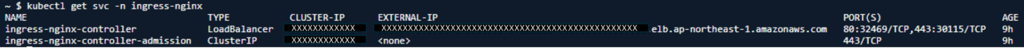 「kubectl get svc -n ingress-nginx」を実行すると、以下のように表示される。
