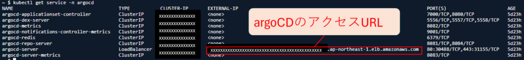 「kubectl get service -n argocd」の実行結果が以下のようになっていたらOK。argocd-serverのEXTERNAL-IPに表示されているURLでargoCDにアクセスできる。