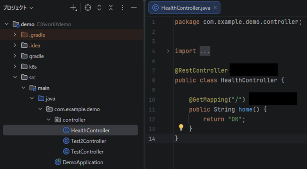 deploymentの設定のlivenessProbeにて、20秒ごとにhealthチェックして起動していなかったら再起動するようにしているため、demoアプリケーション側でhealthチェックの受け口を用意する必要がある。