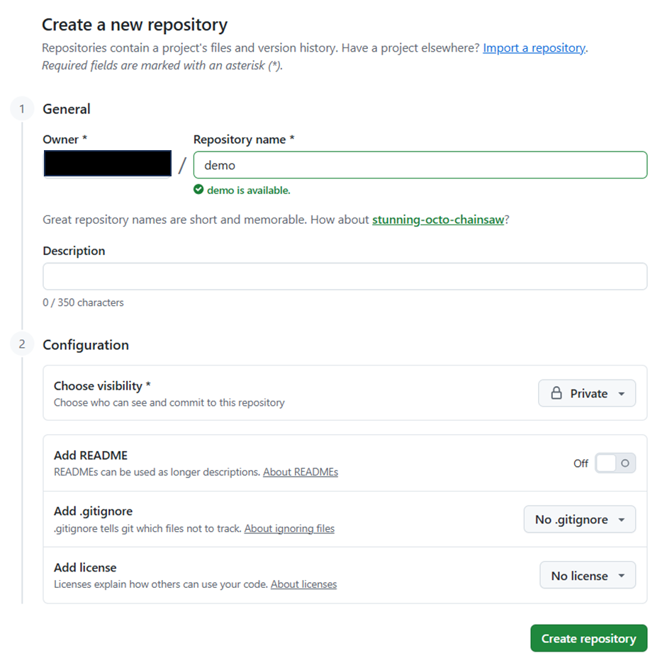 Gthubにアカウントがなければ作成し、Repositories > NewからdemoリポジトリをPrivateで作成する。