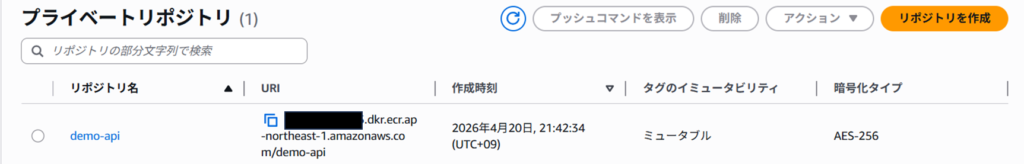 aws ecr create-repository --repository-name demo-api --region ap-northeast-1