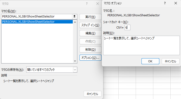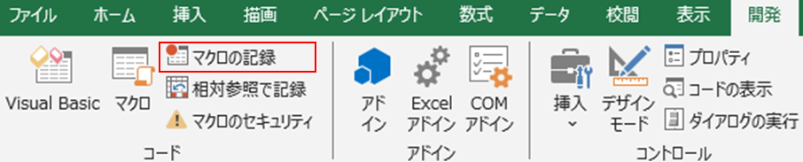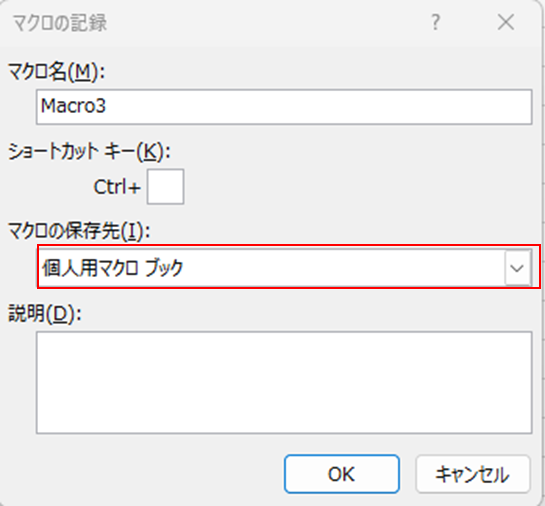 開発>マクロの記録をクリックし、以下のように保存先を「個人用マクロブック」に設定しOKをクリック。