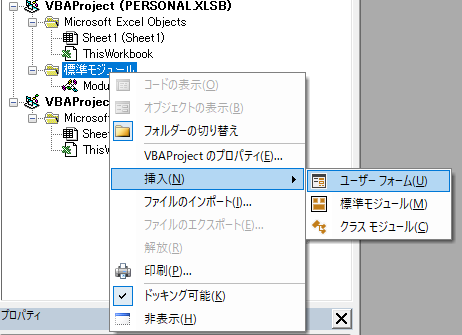 標準モジュールをのところで右クリックし、ユーザフォームを挿入する