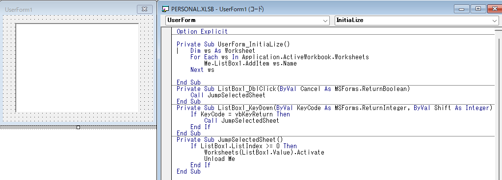 UserForm1に以下のコードを貼り付け(Visual Basicの画面でフォームをダブルクリックするとコードの画面が表示)
