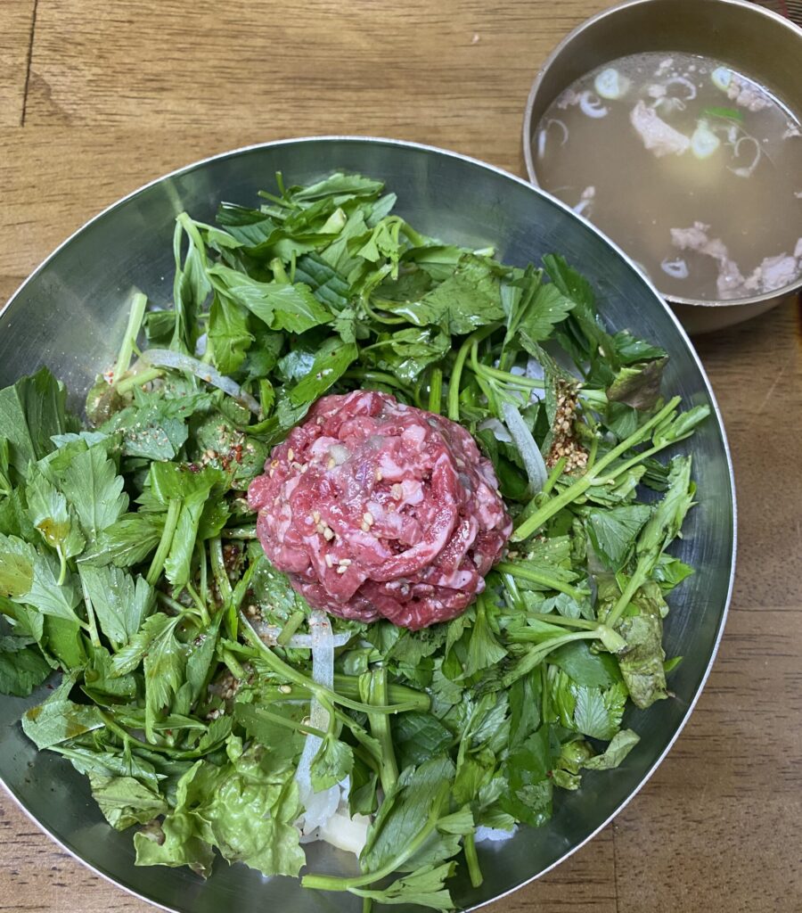 ソウル・聖水(ソンス)エリアを散策していると、ひときわ行列ができているお店を発見。それがユッケ丼の名店「ヌンドンミナリ(능동미나리)」でした。看板メニューのユッケ丼が絶品だとインスタで確認し、お昼時に並んでみました。 並んでいるときにお茶... -