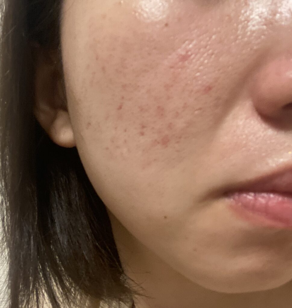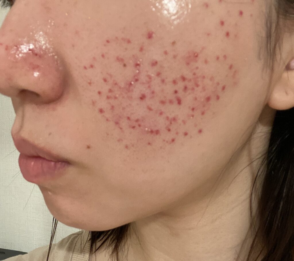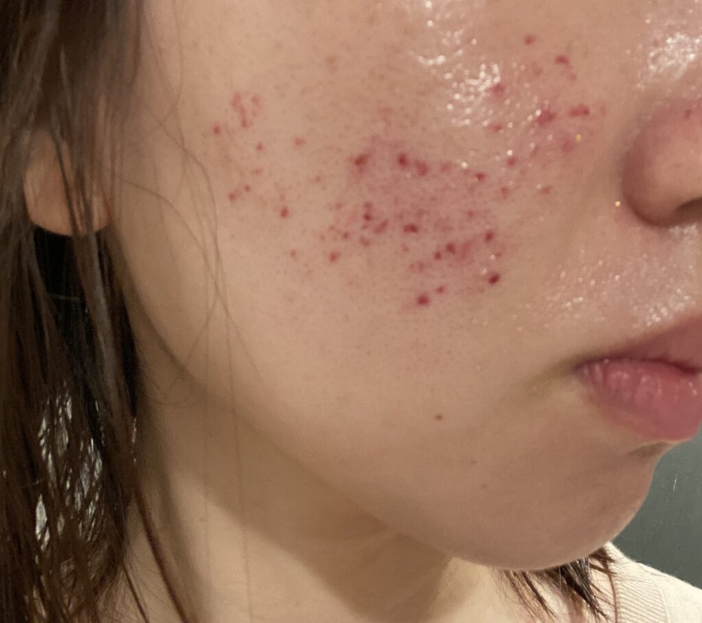 1回目のときと同じく2,3日目から大きな白ニキビが、、、。潰れないように気を付けながら、マスクで過ごしました。