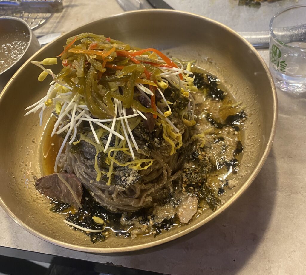 トゥルキルマックスも頼んでみましたが、こちらはお蕎麦のようでした。冷麺のような味、もちもち麺を期待すると期待通りではないです!店員さんが麺も切って、お皿にも取り分けてくれました。